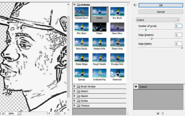 Переходим во вкладку Фильтр (Filter) - Имитация (Artistic) - Аппликация (Cutout) и выбираем Количество уровней (Number of Levels) 3, Простота краев (Edge Simplicity) 3 и Четкость краев (Edge Fidelity) 3.