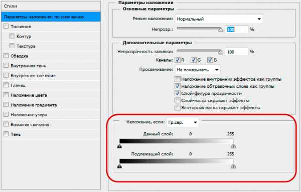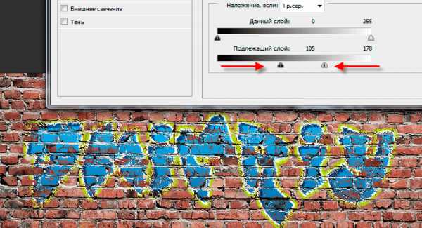 Этот раздел содержит два бара. Верхний для текущего (активного) слоя, и нижний для слоя, находящегося под ним. Оба бара содержат слайдер регулировки теней и светов, которые и позволяют смешивать активный слой, и/или слой под ним (нижележащий слой, или, как в офиц. переводе, подлежащий). В нашем случае, мы хотим смешать тени и блики кирпичной стены (подлежащий слой) с текстом.