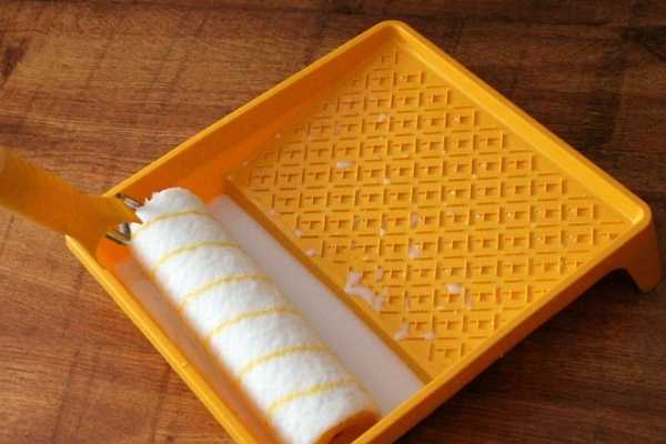 Для аккуратной обработки применять специальную ванночку, у которой поверхность ребристая и слегка наклонена. Прокатывая валик в такой ванночке лишняя жидкость отожмется, и нежелательных потеков на полу и стенах не останется.
