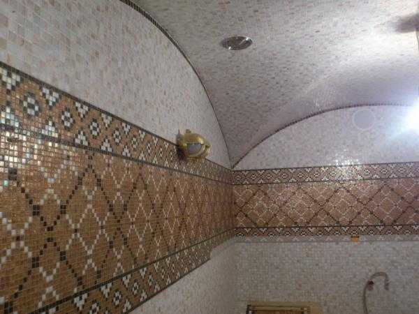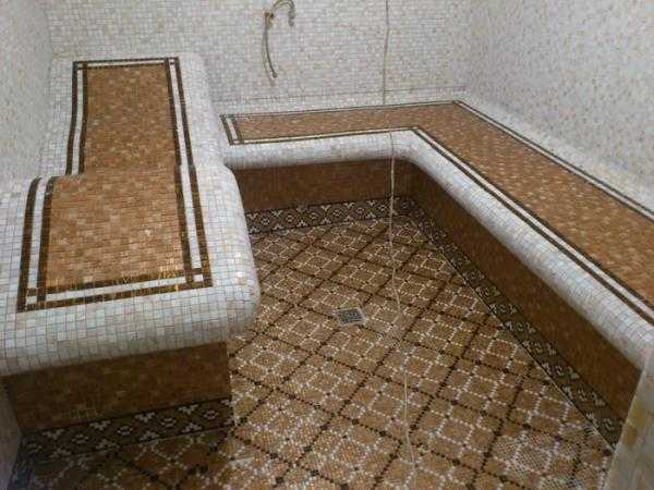 Гранит в отделке турецкой бани применяется как классический вариант, но стоит дорого.Оптимальный вариант использовать для внутренней отделки мраморную плитку или камень. Но современная мозаика из стекла и керамическая плитка не уступают им по качественным характеристикам. Для укладки своими руками проще использовать крупные элементы. Если терпения и навыков достаточно, то можно использовать смальту (мелкие кусочки различной формы выплавленные из смеси кобальта, кремневой кислоты и цветного стекла). Ей выкладывают на стенах бани целые узоры в восточном стиле или полноценные картины. Керамическая мозаика имеет ровную форму и с ней работать своими руками проще.