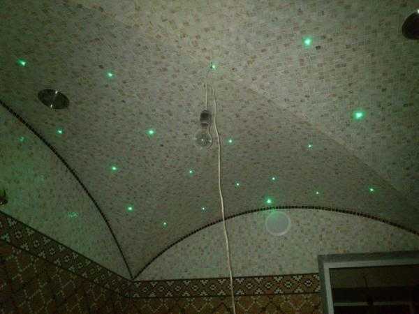 Электропроводку делают из термо и влагостойких кабелей. Для декора можно разместить на потолке оптиковолоконные влагостойкие светильники. Это придаст эффекта и создаёт ощущение звезд над головой. Затем устанавливается курна и монтируется массажная лавка. Их размещают согласно плану-проекту, один из которых представлен на фото в статье.