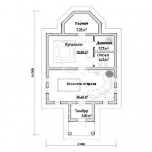 - Создавая проект бани, учитывайте, что помещение должно состоять из двух отдельных частей, одна из которых выделяется под техническое оборудование (парогенератор, осветительное оборудование, система внутреннего обогрева, электрический щит и т.д.). Подсобное помещение занимает около 1 м2.
