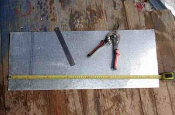1)Полоска оцинкованной жести нужной ширины и толщиной примерно 1мм. Нужно измерить размер трубы и прибавить к этому значению 2 – 3 см для ушек;