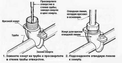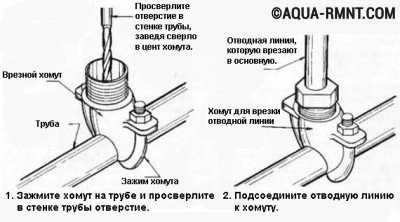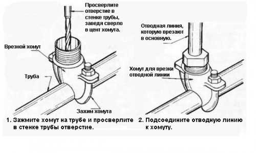 В местах, где предполагается создать место разветвления трубопровода без задействования фитингов, устанавливают врезные хомуты для трубы.