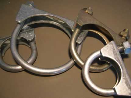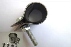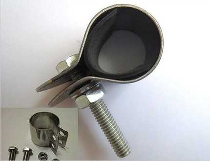 Для устранения неполадок в трубе используют либо крепежные хомуты, либо ремонтные. Хомут-крепеж состоит из металлической оболочки и гофрированной резиновой прокладки, которая позволяет предотвратить появление шума от вибрации и не позволяет вам чрезмерно сдавливать хомут при закручивании. Обязательный элемент такого хомута – это наличие бокового крепления, с помощью которого хомут крепится к разным поверхностям.
