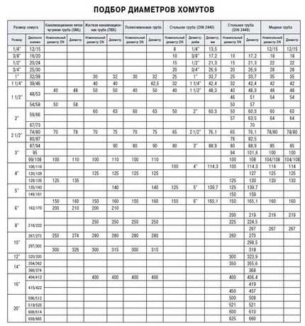 Крепежные хомуты производятся для труб практически любых диаметров. Диапазон диаметров представленных в продаже крепежных элементов – от 14 до 540 мм. Упростить задачу по выбору размерности изделия поможет приведенная ниже таблица.