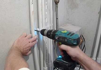 - В обозначенных точках с помощью электродрели просверливают отверстия под монтаж хомутов.