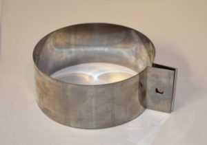 Из отрезка листовой стали вырезают полосу шириной в 4-8 см. Чтобы грамотно рассчитать длину полосы, полученное значение диаметра трубы умножают на число «Пи», т.е. на 3,14. Это и будет длина изделия. Но, чтобы иметь возможность выполнить ушки для фиксации, к значению длины следует добавить еще 3-4 см.