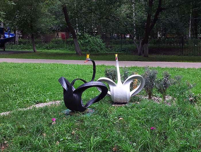 Тело этих декоративных лебедей — из покрышки, а все части из подручных материалов