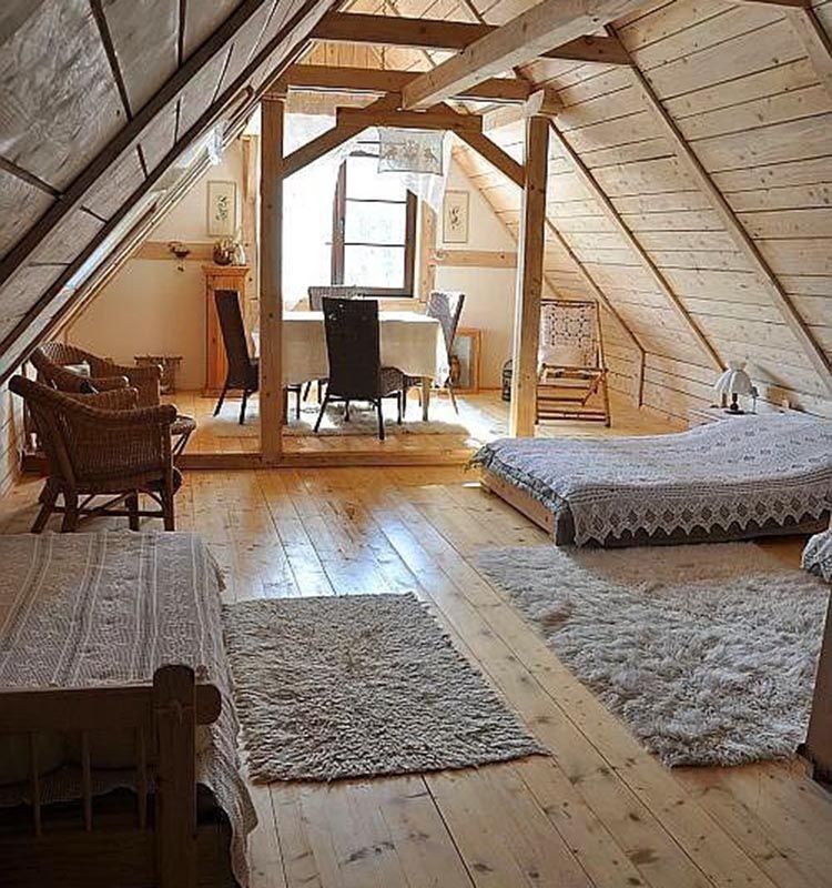 Помещение под крышей подойдет для любых нужд, при достаточном бюджете несложно обустроить даже ванную комнату. Но учитывайте, что на мансардный этаж лучше проникают уличные звуки, особенно шум дождя и птиц, гуляющих по крыше. Если планируете создать там спальню, рабочий кабинет или детскую, стоит позаботиться о дополнительной шумоизоляции. Чердачное помещение изначально используется для хранения вещей.