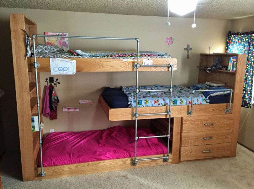Двуспальную кровать можно превратить в двухъярусную, если вы хотите больше места в детской спальне. В комнате можно сэкономить более 20 квадратных футов площади, превратив две односпальные кровати в двухъярусные.