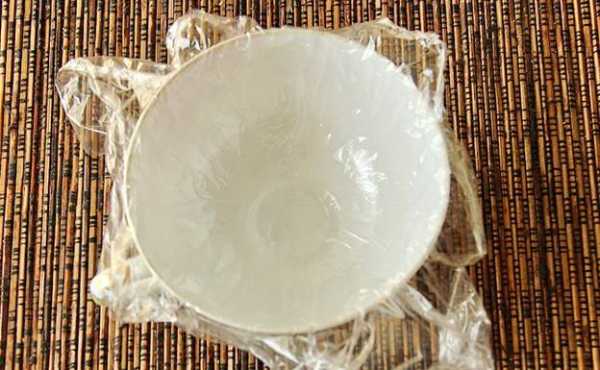 Чтобы сделать шляпку для гриба, мы берем подходящую по форме чашку и покрываем ее поверхность пищевой целлофановой пленкой. Стараемся приложить пленку как можно плотнее к чашке и оставить как можно меньше складок.