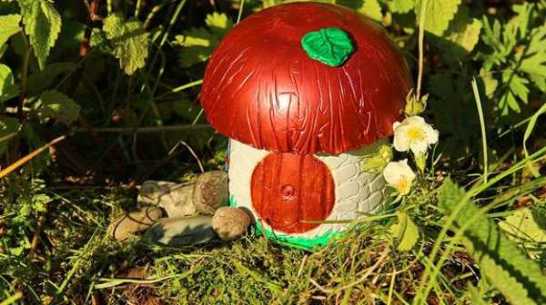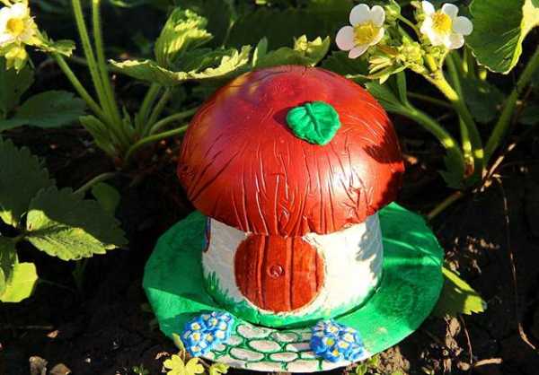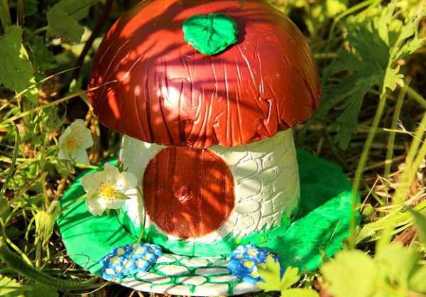 Самым простым вариантом украшения для сада является грибок. Его очень просто сделать своими руками. Для ножки стоит использовать в качестве формы обрезанную бутылку со смазными милом стенками. Для изготовления шляпки можно использовать большую тарелку закрытую полиэтиленовой пленкой.