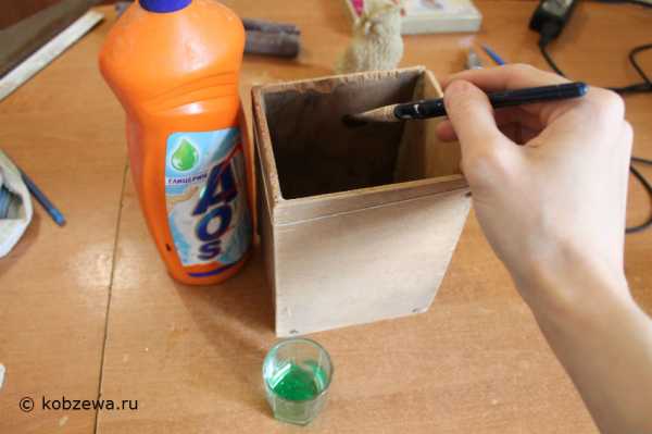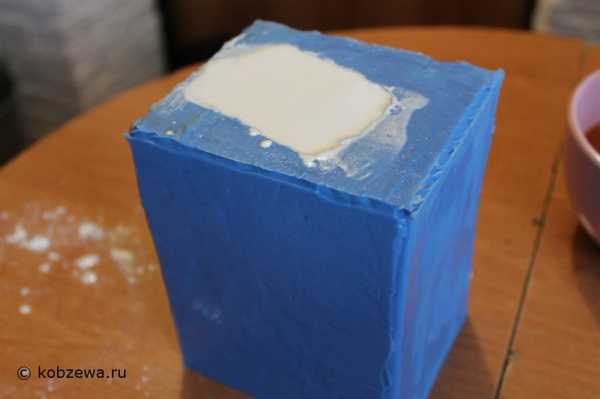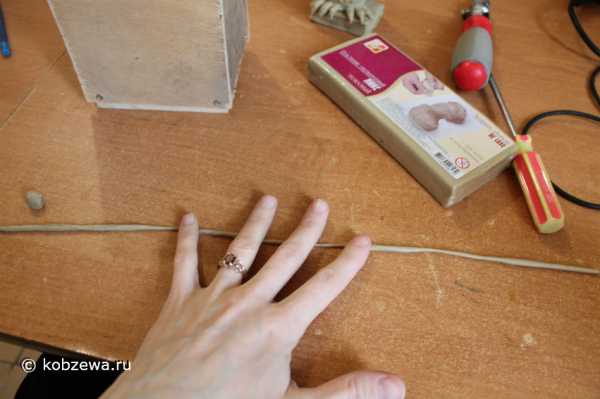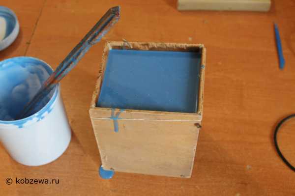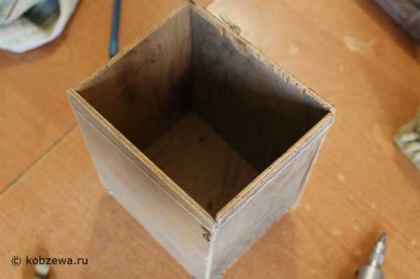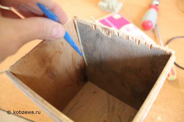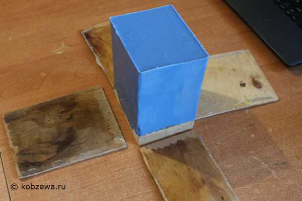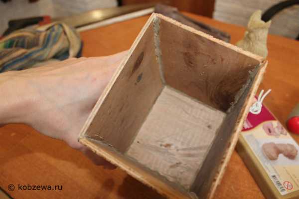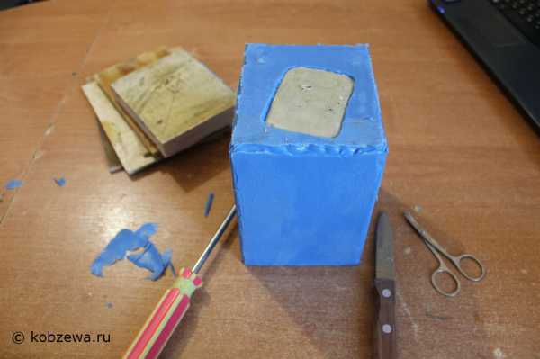 Сначала я отмерила и отрезала дно будущего короба, оно должно быть со всех сторон на 1 см больше, чем ширина фигурки. Далее опилила ножовкой четыре боковых стенки, прикрепила их саморезами к дну, и получилась коробочка без верха. Кстати, при отпиливании еще раз поместите пластилиновую заготовку в короб, чтобы не получилось так, что между фигуркой и стенкой будет очень маленькое расстояние. В идеале – 1-1.5 см.
