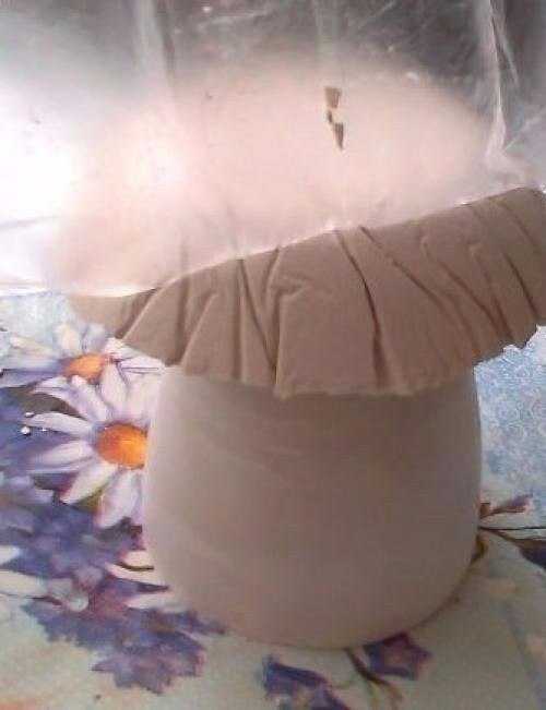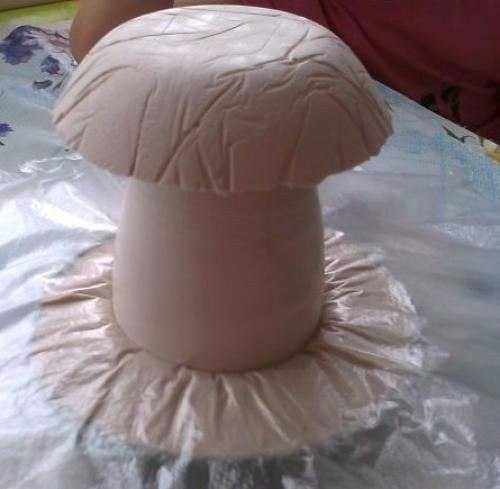 Когда гриб застынет, делаем площадку-основание для фигуры. Для этого подбираем подходящую по форме и размеру чашку, покрываем ее пищевой пленкой или эмульсией для смазки.
