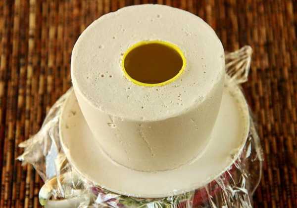 Разводим гипс и выливаем его в чашку. Ножку гриба можно погрузить туда же, но мы советуем сделать ее съемной, так будет удобнее работать с оформлением гриба. Для этого ножку гриба закрываем целлофановой пищевой пленкой и погружаем в гипс в чашке.