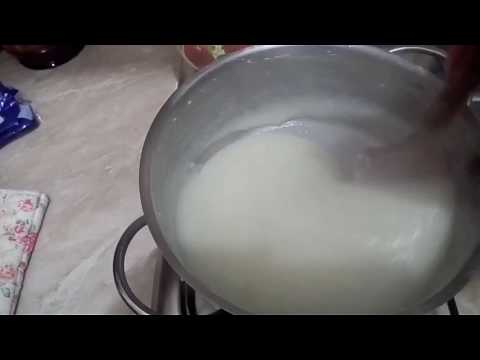 Влейте смесь в кипящую воду, постоянно помешивая. Смесь будет пениться при кипении, поэтому продолжайте помешивать. Добавьте больше воды, если смесь станет слишком густой для перемешивания. Снимите с огня, когда смесь станет густой и гладкой. Добавьте сахар и перемешайте, чтобы он стал липким.