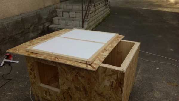 - Для крыши из бруса сбиваем раму. Изнутри ее обшиваем доской. В ячейки укладываем пенопласт, а сверху крепим плиту ОСБ. Ее надо вырезать большего размера, чем сама будка, чтобы получился козырек.