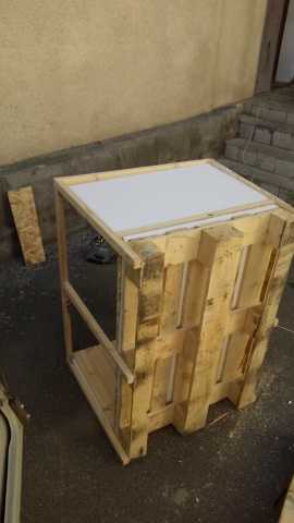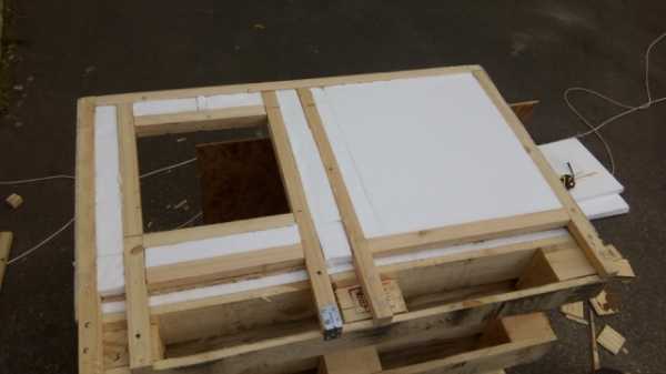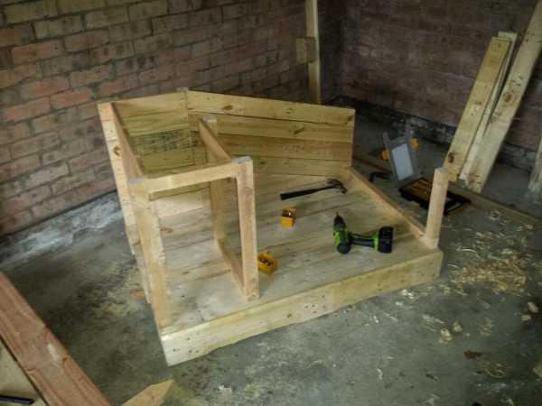 Я забыл сфотографировать этот этап работы, для основы использовал евро паллету. Добавил еще рейки, чтобы закрыть щели между соседними досками. Так же приколотил доски от других паллет, к боковым сторонам поддона, чтобы туда не задувал ветер. Зашкурил и скруглил края, где это возможно. Это позволило поднять пол на достаточную высоту, чтобы он не намокал и был достаточно теплым.