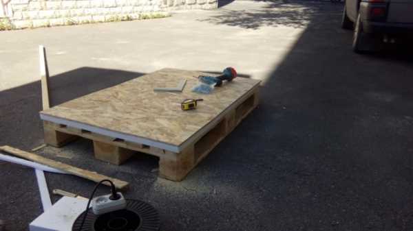 - Благодаря поддону, будка у нас получится на ножках, и внутрь никак не проникнет сырость и дождевая вода. Домик делаем утепленный, поэтому на поддон укладываем лист пенопласта толщиной 20 мм, а сверху крепим саморезами плиту ОСБ.