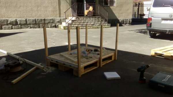 - По углам и центру длинных сторон поддона прибиваем стойки из бруса сечением 50х50 или 40х40 см.