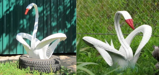 Сделать лебедя своими руками можно из чего угодно. Подойдет любая бумага – как обычная, так и плотный картон. Можно использовать фетр, пластик (бутылки, хозяйственные пакеты, пленка), природные материалы – шишки, кленовые семена, крупы, автомобильные покрышки. Красивая птица в виде аппликации или статуэтки дополнит интерьер, будет служить ландшафтным украшением, станет основой цветочной клумбы.