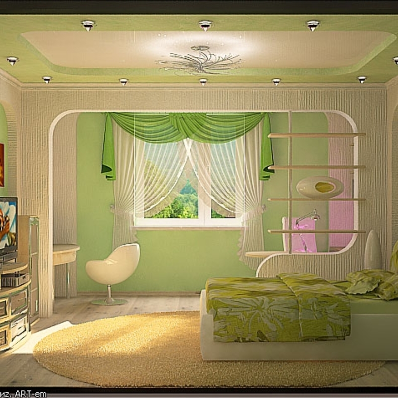 В гостиной, детскую зону можно оформить фантазийными и красочными деталями. Например, для девочек подбирают мебель стилизованную под дворец, кукольный домик, замок и много другое. Мальчикам подойдут машинки, космические, пиратские корабли или вигвамы.