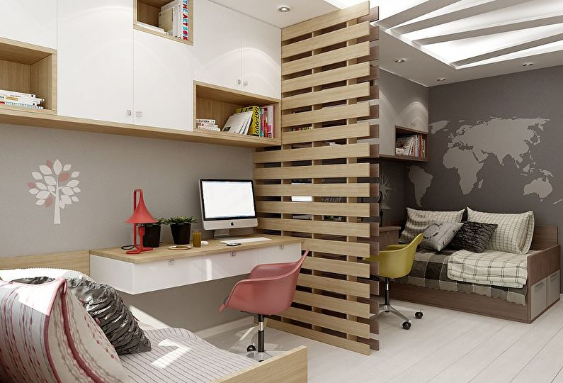 Если требуется совместить гостиную со спальней для двоих детей одинакового возраста в одной комнате, важна грамотная организация личного уголка для каждого ребенка. Для того, чтобы сэкономить место в помещении рекомендуется установка двухъярусных кроватей, раскладных, выдвижных и других трансформирующихся конструкций.