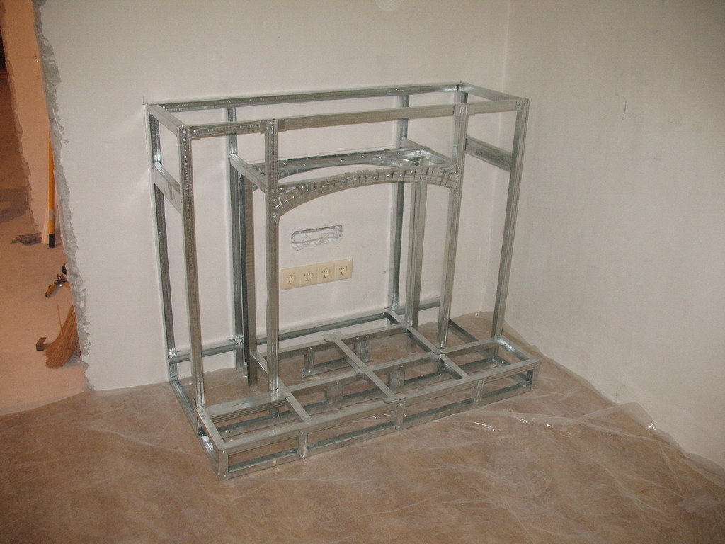 Каркас камина можно соорудить из оцинкованного профиля для гипсокартона (так называемый профиль «ЦД» и «УД») – обрезки его часто остаются после ремонта, и можно их использовать. Если вы планируете установить внутрь электрокамин, для основных ребер жесткости профиль лучше брать более прочный, например ПН-2 75х40х0,6. Для декоративного камина достаточно профиля ПН-2 50х40х0,5.