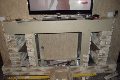 Готовую конструкцию зашпаклюйте, после чего можно производить облицовку любыми материалами. - В готовую нишу установите электрокамин.