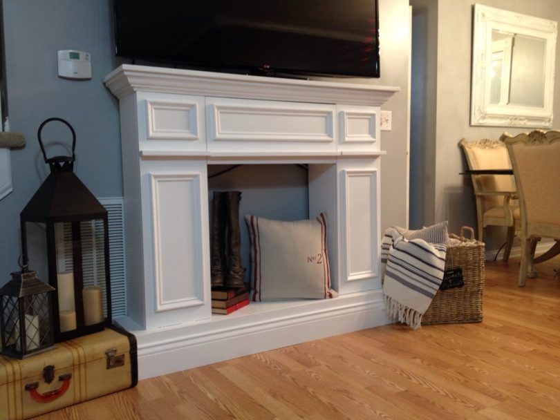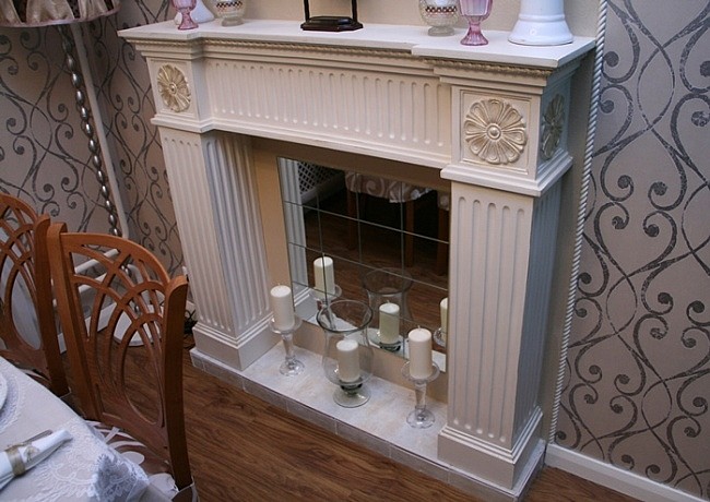 Вы удивитесь, но весьма привлекательный фальш-камин можно изготовить из картонной коробки из-под крупной бытовой техники (например, телевизора, как на примерах). Кроме того, для работы вам понадобятся различные декоративные элементы и большое количество клея. Сами декоративные элементы, к слову, можно сделать самому, используя для этого пенопласт или особые выпуклые обои. Для имитации колонны или лепнины можете приобрести специальные декоративные элементы из пенополиуретана, которые продаются во многих специализированных торговых точках.