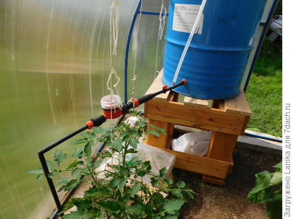 При установке капельного полива нужно учитывать то, что емкость с водой должна стоять на возвышении, тогда в трубках образуется правильное давление для подачи воды к почве.