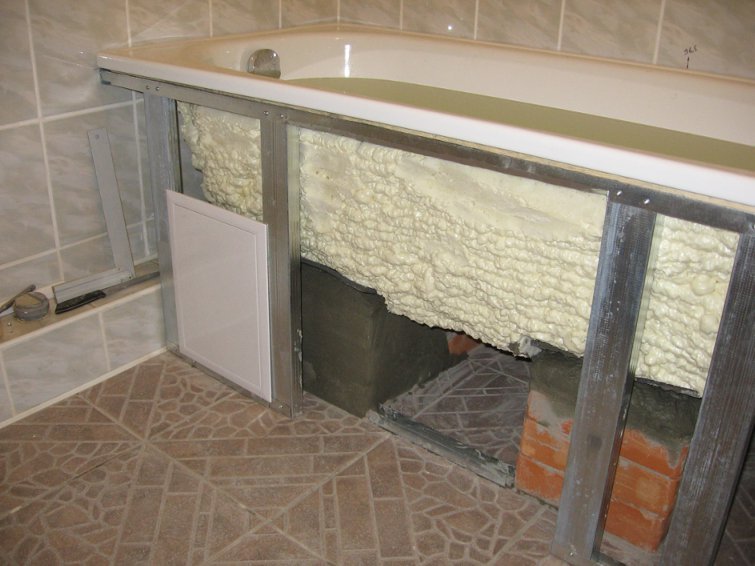 После застывания пены приступаем к монтажу каркаса под экран и скрываем его листом гипсокартона.