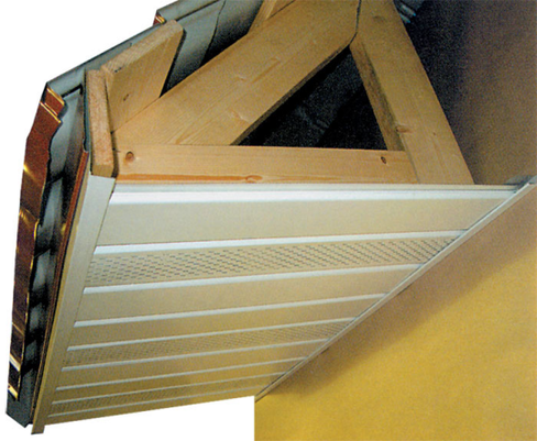 Софиты — это панели, специально предназначенные для подшивки карнизных и фронтонных свесов. От сайдинга их отличает наличие перфорации. И в этом их главное преимущество. Через эти отверстия легко проникает воздух, но при этом вода через них пройти не может. Отличия есть и по ширине. Панели софитов гораздо шире чем сайдинг, поэтому процесс подшивки займёт гораздо меньше времени.