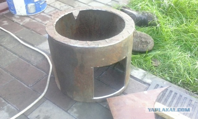 - В нижней части листа вырезаем отверстие, куда потом будем загружать топливо.