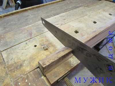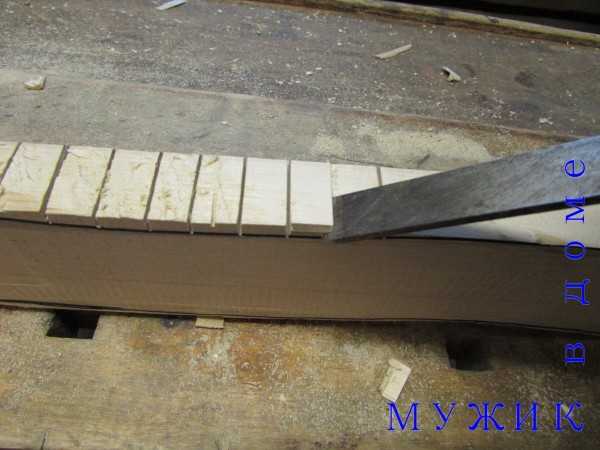 Деревяшку для удобства зажимают и выполняют ножовкой поперечные пропилы с шагом 35–40 мм, не доходящие до линии разметки на 2–4 мм.