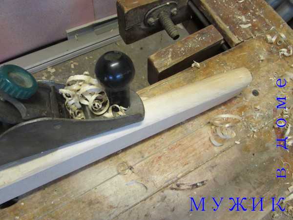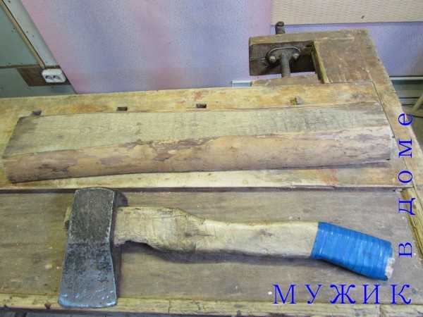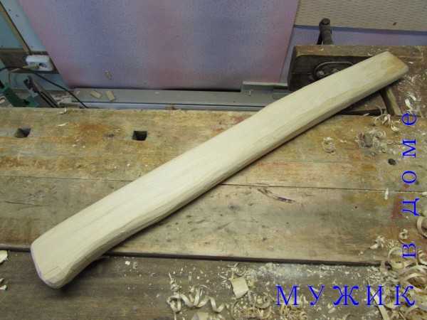 Работая аккуратно, снимают тонкую стружку и периодически переворачивают деталь для изменения направления среза. В итоге получают почти готовое топорище.
