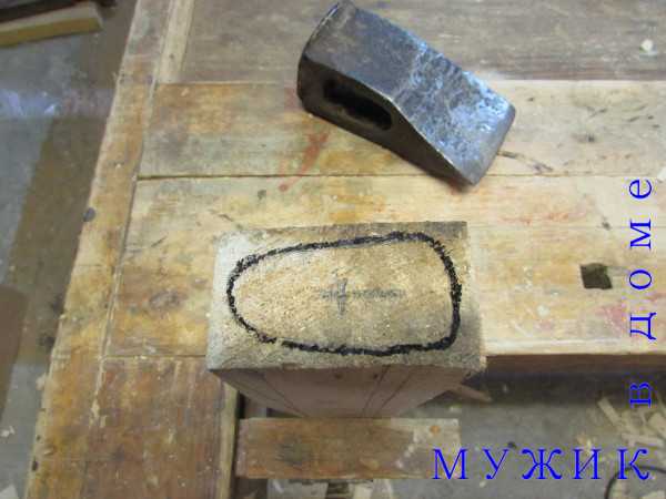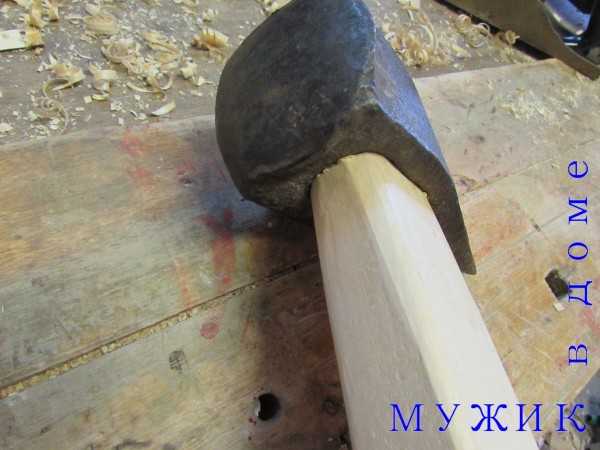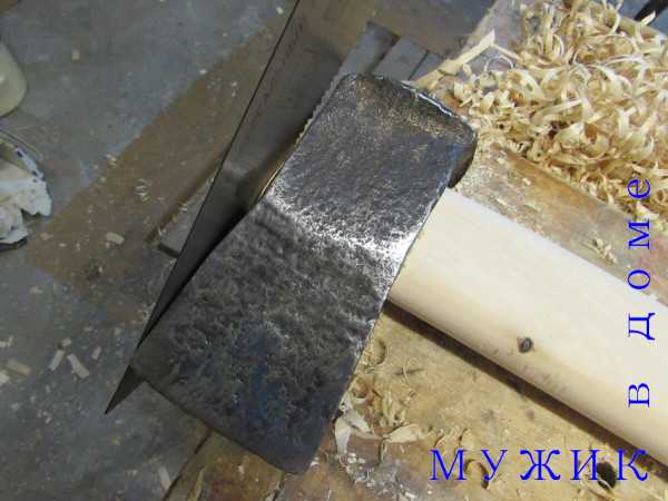 Пробуют слегка вставить рукоятку в проушину, после чего на древесине останутся отпечатки, показывающие сколько материала требуется снять.