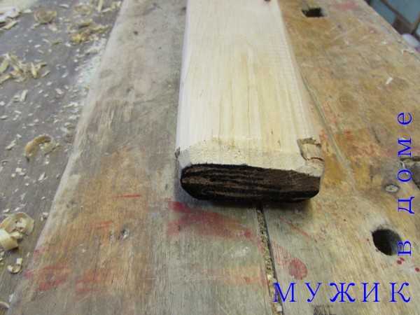 Из просушенной чурки сначала делают брусок толщиной на 3–5 мм превышающей ширину посадочного отверстия. Запас позволит позднее скорректировать заготовку в случае ошибочного снятия где-либо лишней древесины. При необходимости удаления толстого слоя используют топор или циркулярную пилу, затем поверхности остругивают рубанком, одновременно выравнивая плоскости.