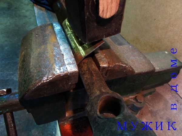 Для предохранения топорища от случайных промахов из стальной пластины толщиной 2–3 мм изготавливают накладку. Металл сгибают молотком, зажав деталь в тисках вместе с подходящей железной болванкой.