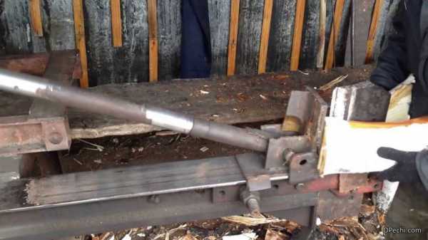 Гидравлический колун в действииПри изготовлении такого колуна своими руками важно обратить внимание на станину. Она должна быть сделана из стального швеллера с толстыми стенками. По ней будет осуществляться ход поршня с режущим элементом. Применение такого механизма позволяет за один ход получить расколотые бревна на несколько частей. Важно при таком способе кола обзавестись дополнительными направляющими.