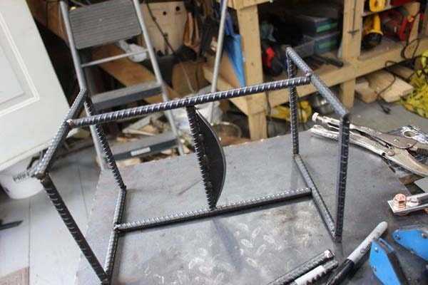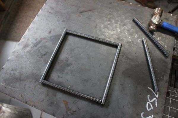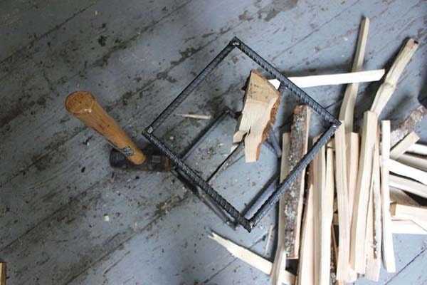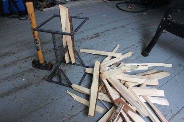 - Следующим этапом сверху прутьев (те, которые торчат выше креста) делаем ободок – неважно, круглый или квадратный, как вам будет удобно. В его задачи входит удерживать полено вертикально. Благодаря ободку полено не будет падать.