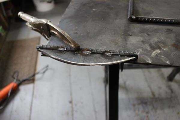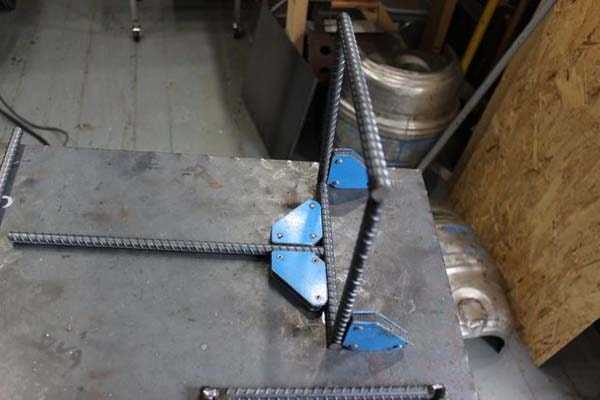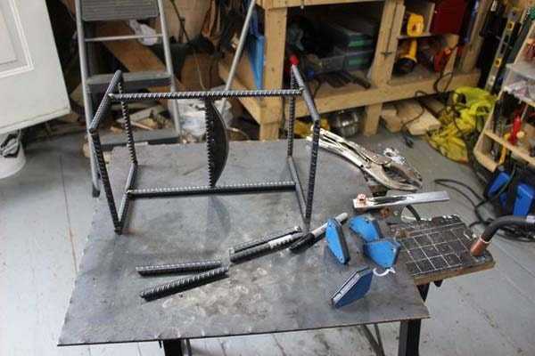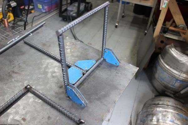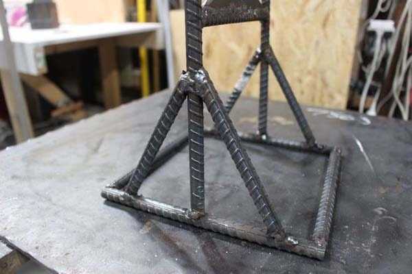 - Берем этот крест и с каждой его стороны привариваем прут, предварительно порезанный на равные отрезки длиной 400-500 мм. Привариваем так, чтобы низ креста располагался на расстоянии 250 мм от края прута. Грубо говоря, приделываем кресту ноги, которые поднимут его над землей сантиметров на 25.
