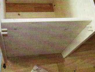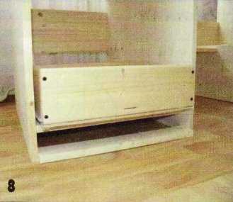 Нижние проемы под полкой и тумбочкой закрываем панелями цоколя, используя в качестве крепежа шканты без клея.