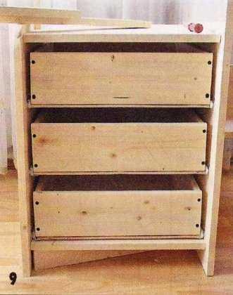 Стенки ящиков выпиливаем из доски 12х120 мм, днища – из фанеры. Скручиваем по четыре заготовки саморезами, снизу пришиваем дно. Ширина и глубина ящиков зависит от внутренних параметров тумбочки и толщины направляющих.