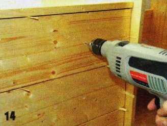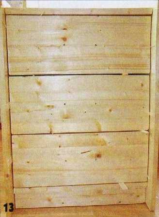 Теперь выставляем панельки в проеме передней стороны тумбочки, используя клинышки. Делаем метки для отверстий в передних стенках ящиков (можно просунуть шило в отверстия на панелях и наколоть древесину стенок). Просверливаем места отметок.