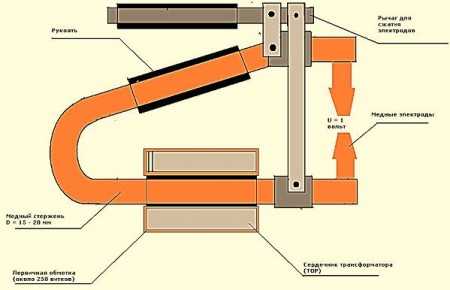 Изготовление электродов является такой же ответственной операцией, как и сборка трансформатора. Необходимо заранее запастись медными прутьями, стержни должны иметь диаметр не меньше, чем толщина провода. Для изготовления сварки с невысокими техническими характеристиками, подойдут рабочие элементы от мощных паяльников. В процессе работы, особенно при частом использовании точечной сварки, происходит интенсивный износ электродов. Поэтому рекомендуется сразу же изготовить запасной комплект. При сборке всей конструкции должна использоваться схема контактной сварки.