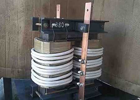 Трансформатор выглядит следующим образом: это сердечник с двумя обмотками, первая из которых сделана толстым проводом с меньшим количеством витков.