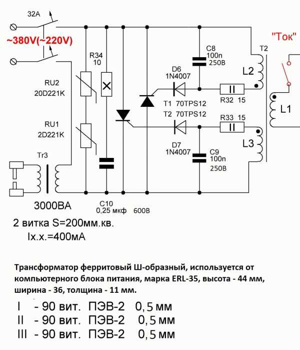Импульс тока создается во вторичной обмотке трансформатора. К первичной обмотке трансформатора подключены конденсаторы С8-С9. Именно благодаря им образуется разряд, необходимый для получения импульса. Управление разрядом конденсаторов осуществляется в тиристорах Т1 и Т2. По цепочке от входного трансформатора «Ток», заряжается конденсатор. Также в схеме отображено выпрямление тока диодами D6-D7.