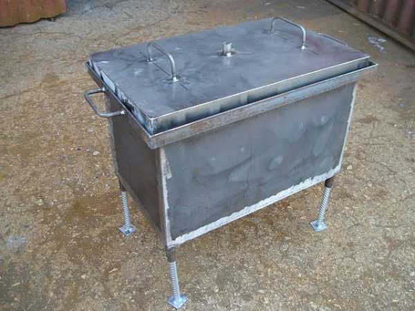 Очень удобный и простой вариант – холодная коптильня своими руками из листованного железа. Достаточно лист разрезать, согнуть в форме куба и сварить по швам. При желании камеру можно выполнить из старого холодильника, духовки или скороварки.